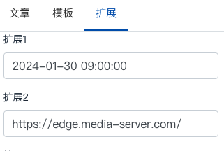 扩展:在“扩展1”中填入活动日期,这个日期非常重要,格式如图。在“扩展2”中填填入报名这个活动的地址,一般是使用第三方服务进行报名。在第三方网站生成链接后复制到该此